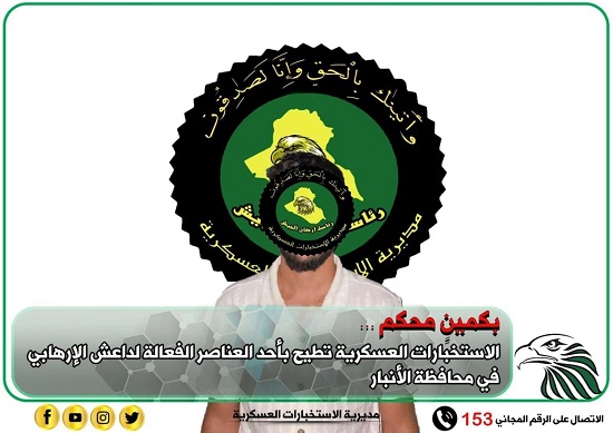أعلنت مديرية الاستخبارات العسكرية، اليوم السبت ، الإطاحة بأحد العناصر “الفعّالة” لداعش الإرهابي في محافظة الأنبار.