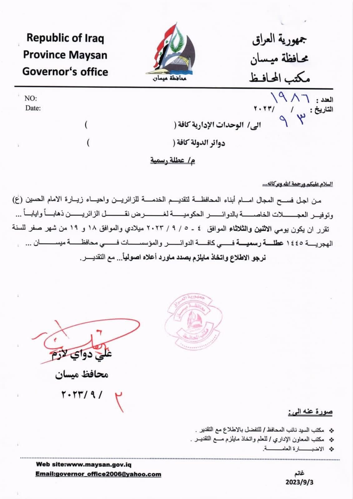 وبحسب وثيقة صادرة عن محافظ ميسان علي دواي ، فإنه “تقرر تعطيل الدوام الرسمي يومي الاثنين والثلاثاء الموافق 4-5/9/2023 في كافة الدوائر والمؤسسات في محافظة ميسان”.