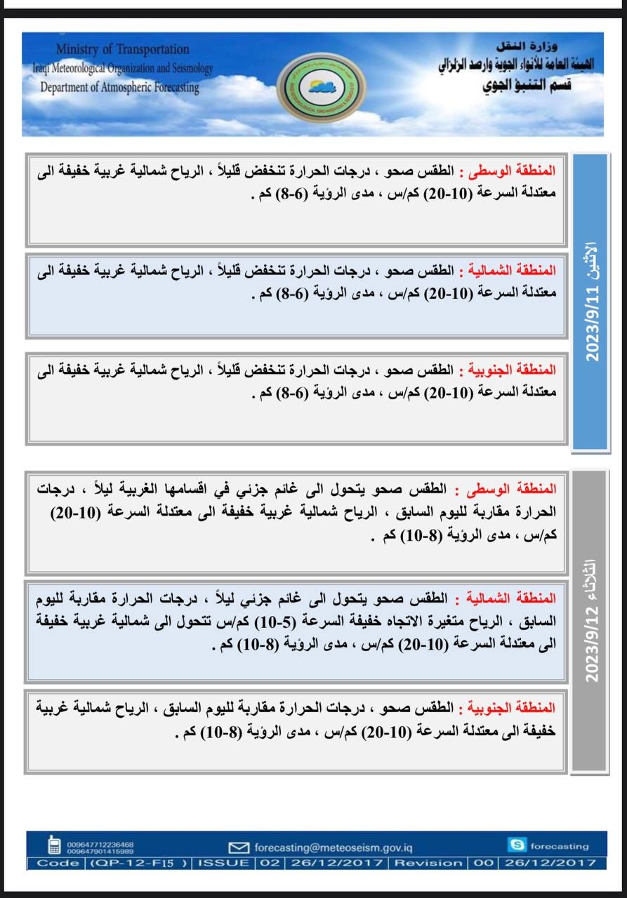 وحسب النشرة الجوية للأنواء، فأن” المناطق الغربية من العراق ستشهد تصاعدًا للغبار مع رياح شمالية غربية إلى معتدلة السرعة ستؤثر نوعا ما على مدى الرؤية”.