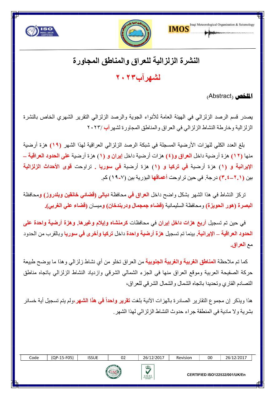 أصدرت وزارة النقل/ الهيئة العامة للأنواء الجوية والرصد الزلزالي ،قسم الرصد الزلزالي التقرير الشهري الخاص بالنشرة الزلزالية الشهرية في العراق والمناطق المجاورة لشهر آب 2023 .
