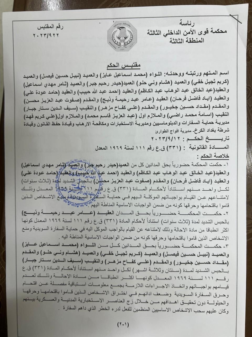 وبحسب قرار المحكمة ،فانه تم حبس ضباط لمدد مختلفة بين 3 سنوات وسنة لعدد منهم في مديرية حماية السفارات ومديرية الاستخبارات ومكافحة الإرهاب وقيادة حفظ القانون وطرد آخرين وذلك لامتناعهم عن القيام بواجباتهم الموكلة اليهم في حماية السفارة السويدية”.