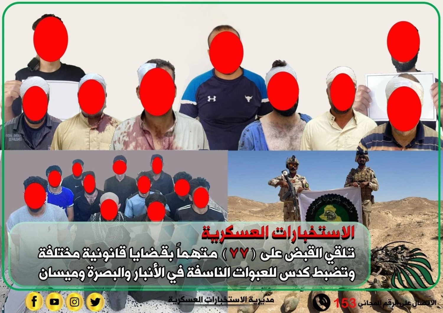 وذكر بيان للمديرية ، أنه “بعمليات منفصلة وجهود حثيثة واستناداً الى معلومات استخبارية دقيقة لمديرية الاستخبارات البحرية وأقسام وشعب قيادة عمليات البصرة وميسان والجزيرة والفرقة السابعة التابعة الى مديرية الاستخبارات العسكرية، وبالتعاون مع القوات الأمنية الماسكة للأرض، تم نصب كمائن محكمة في مناطق متفرقة من المحافظات ذاتها، أسفرت عن إلقاء القبض على 77 متهماً بقضايا قانونية مختلفة في قضاء القائم والمجر الكبير والكحلاء والهارثة والشافي وناحية أم قصر ومنطقة أبو صخير”، مؤكداً “تسليم المتهمين الى الجهات المعنية وفق السياقات المعمول بها”.
